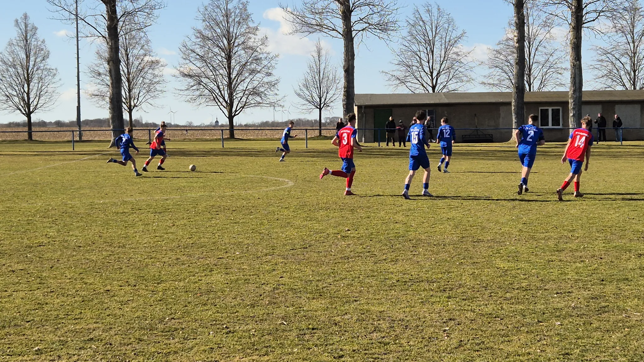 Zum zweiten Mal in dieser Saison musste unsere U19 nach Antrag des Gegners im 9 gegen 9 antreten. Nach anfänglichen Schwierigkeiten fand sich unser Team aber recht schnell im ungewohnten taktischen Konzept zurecht und übernahm bis zum Abpfiff die Spielkontrolle. Sukzessive wurde dabei das Ergebnis gegen einen nie aufsteckenden Gast ausgebaut.