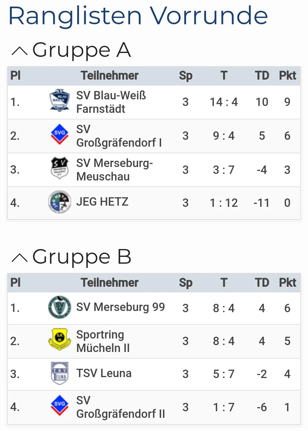 In Vorrundengruppe A qualifizierten sich Farnstädt und SVG I souverän für das Halbfinale. Spannender verlief die Vorrundengruppe B, in der Merseburg 99 im letzten Gruppenspiel noch an Mücheln und Leuna vorbeizog.
