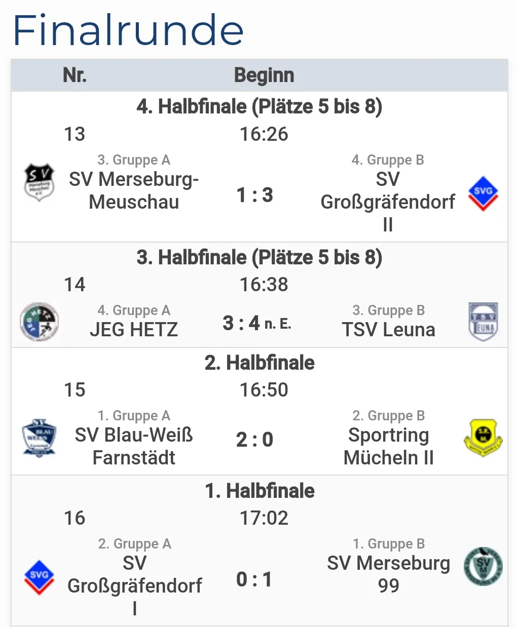 In den Halbfinals um die Plätze 1-4 setzten sich dann die beiden Gruppensieger, Farnstädt mit 2:0 gegen Mücheln und Merseburg 99 mit 1:0 gegen SVG I, durch.