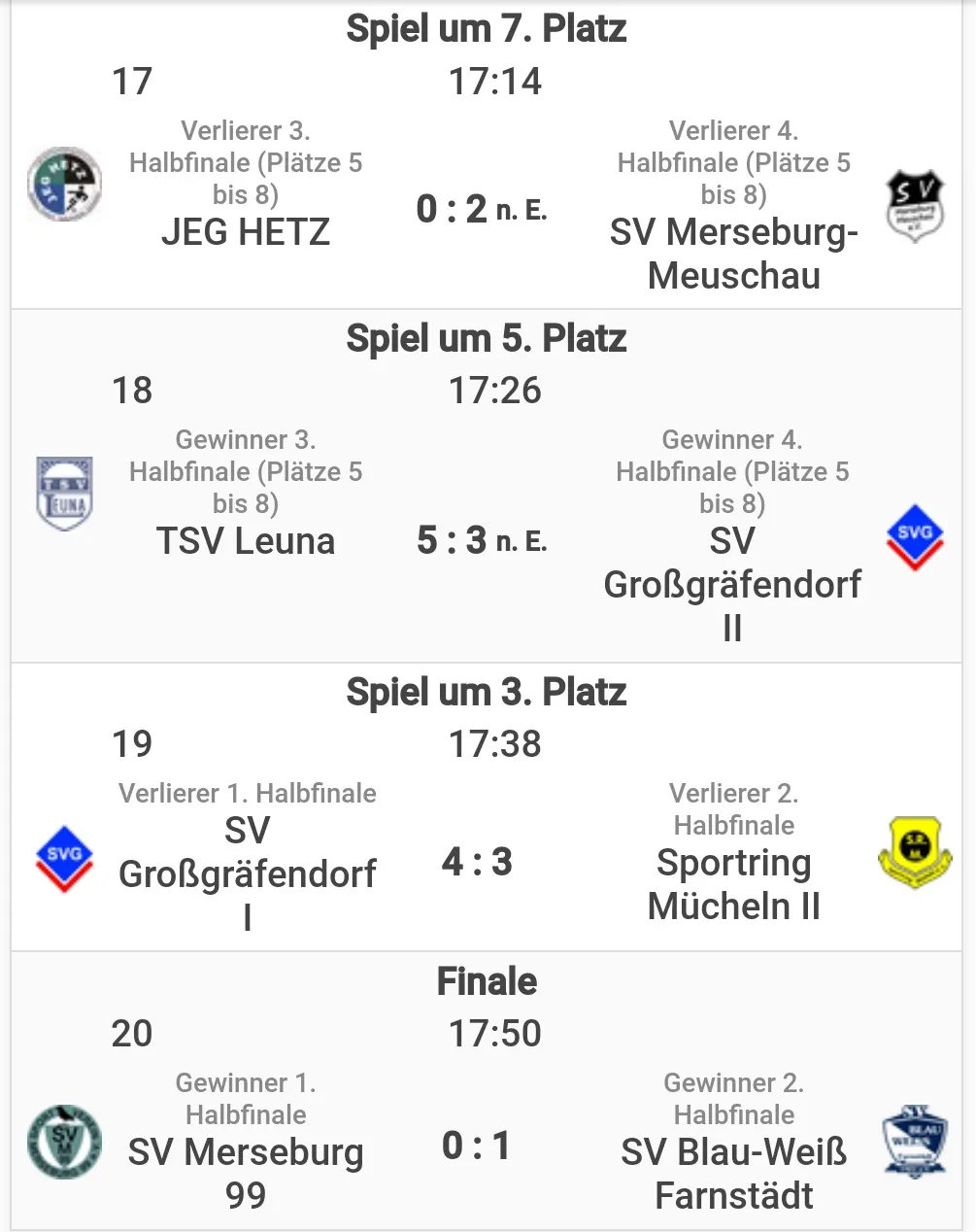 Sehr eng ging es auch in den Platzierungsspielen zu. SVG II verlor das Spiel um Platz 5 3:5 nach Neunmeterschießen gegen Leuna. SVG I setzte sich knapp mit 4:3 gegen Mücheln durch und errang den Bronzeplatz. Den Turniersieg durfte Farnstädt nach einem 1:0 Erfolg gegen Merseburg 99 feiern.