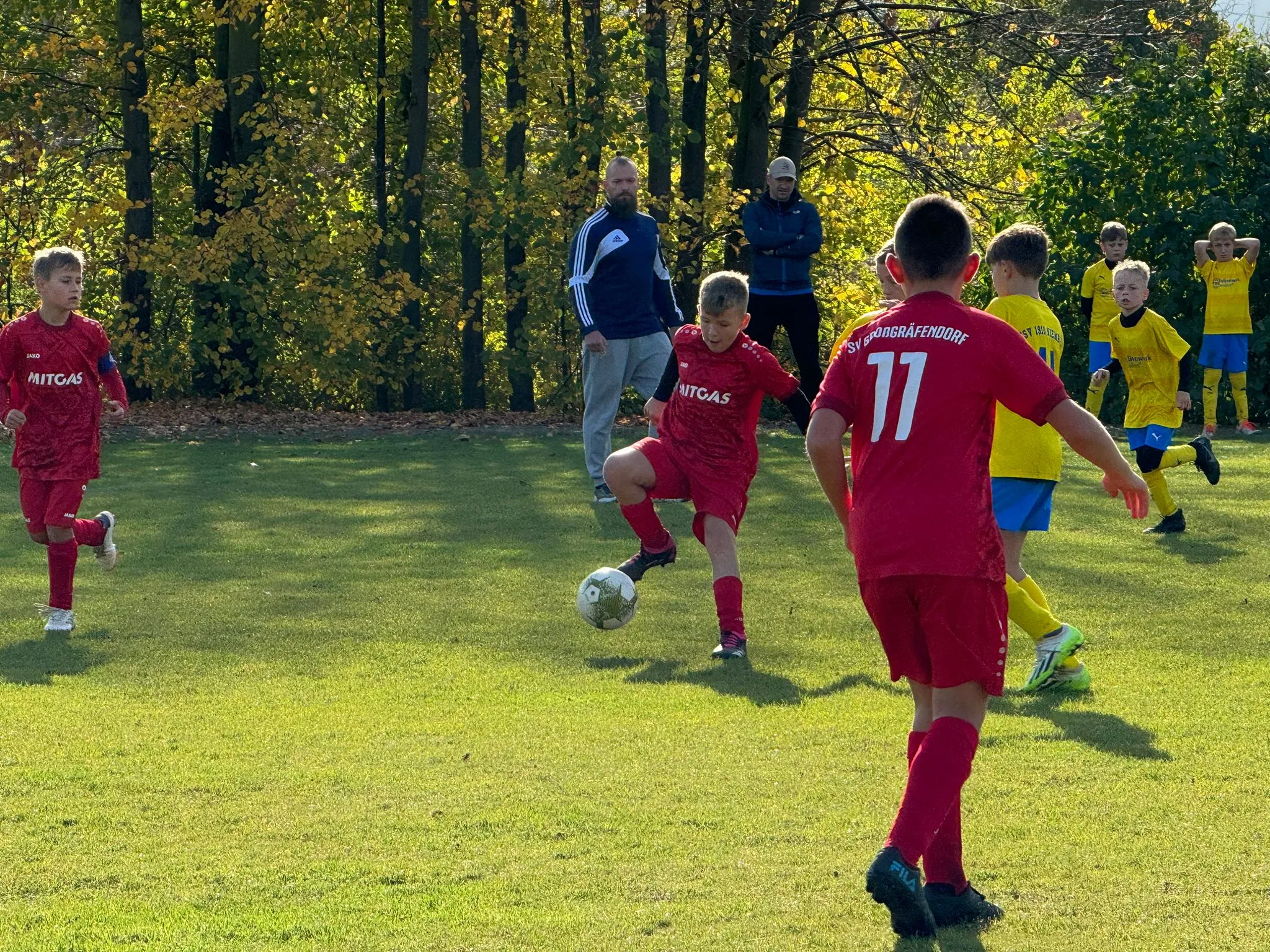 Der Beginn war etwas holprig, bis sich die Kids an die geänderte Formation gewöhnt hatten. Nach einem Bilderbuchangriff schoss Julian nach zehn Minuten zur Führung ein. Bei der 4:0 Halbzeitführung ist zudem Marlons platzierter Flachschuss zum 3:0 herauszuheben.