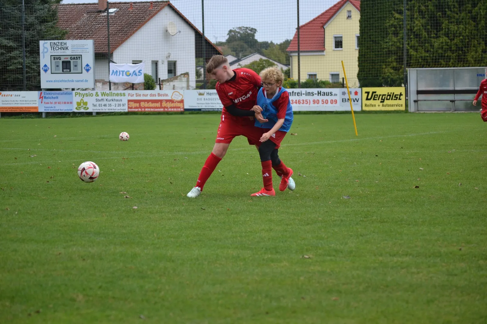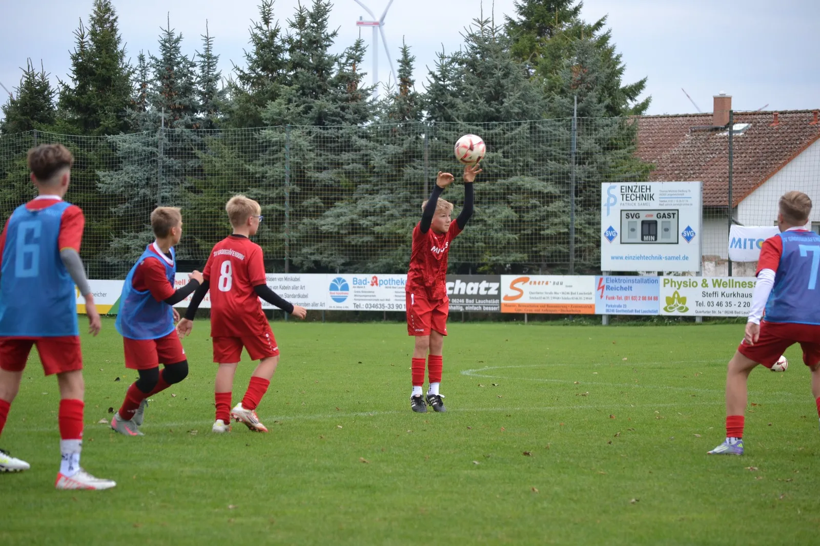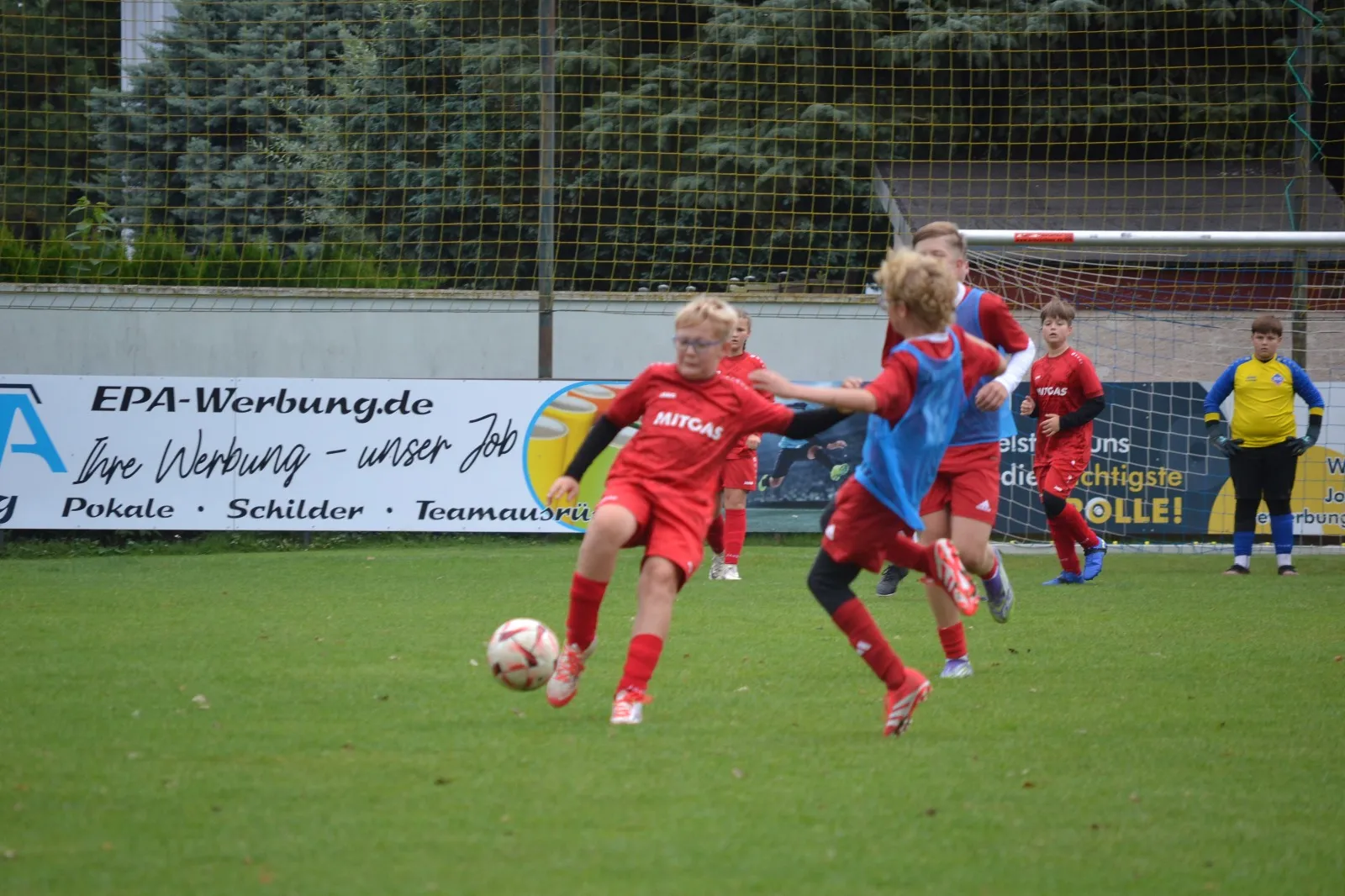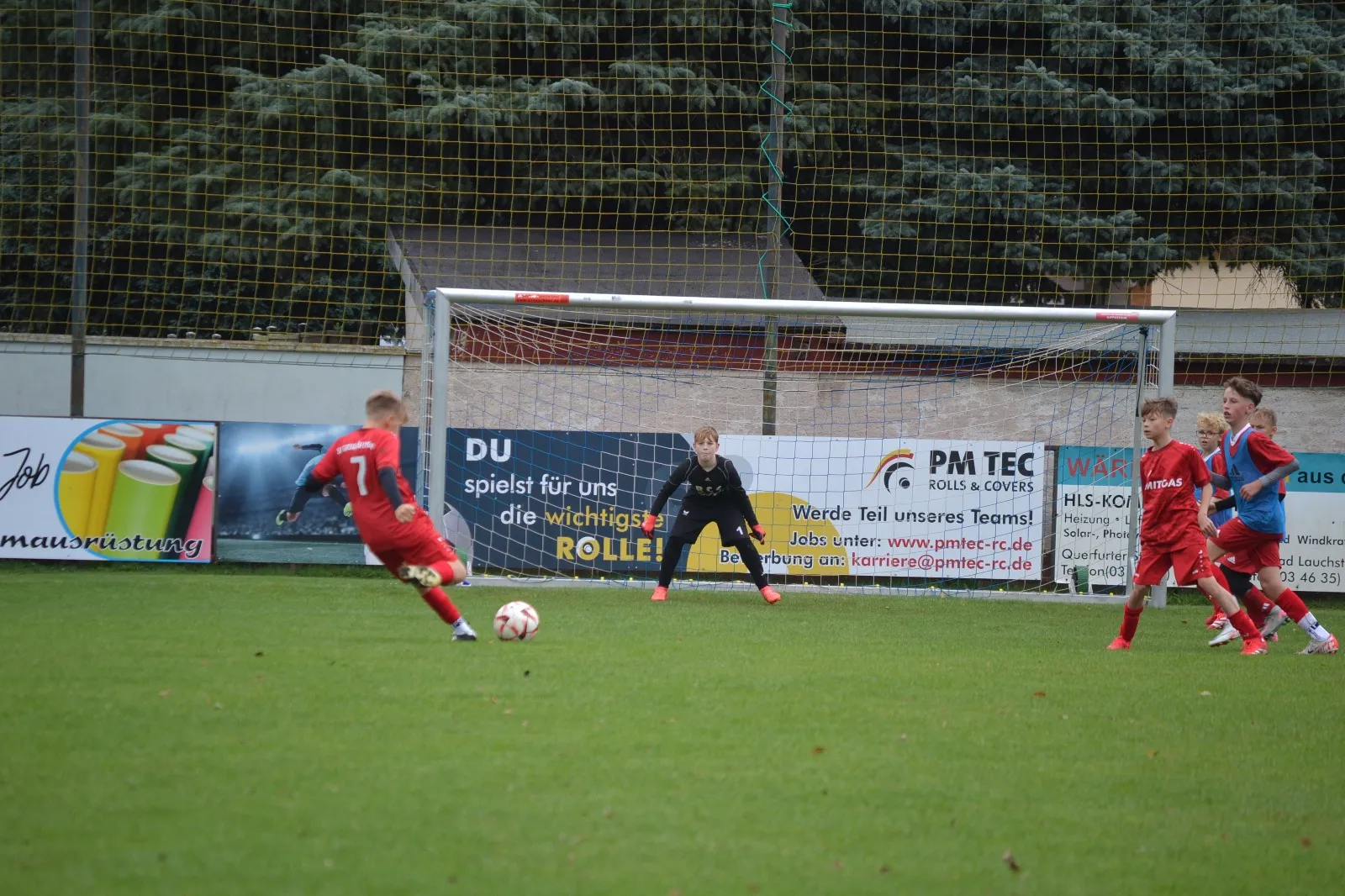 Von Beginn an entwickelte sich ein Spiel auf Augenhöhe. Die erste Großchance verzeichnete die D1 als Lukas freistehend über das Tor schoss (10.). Auf der anderen Seite schoss Julian einen Freistoß vor den Pfosten (14.). So ging es bis zur Pause hin und her, aber beide Torhüter hielten ihren Kasten sauber.