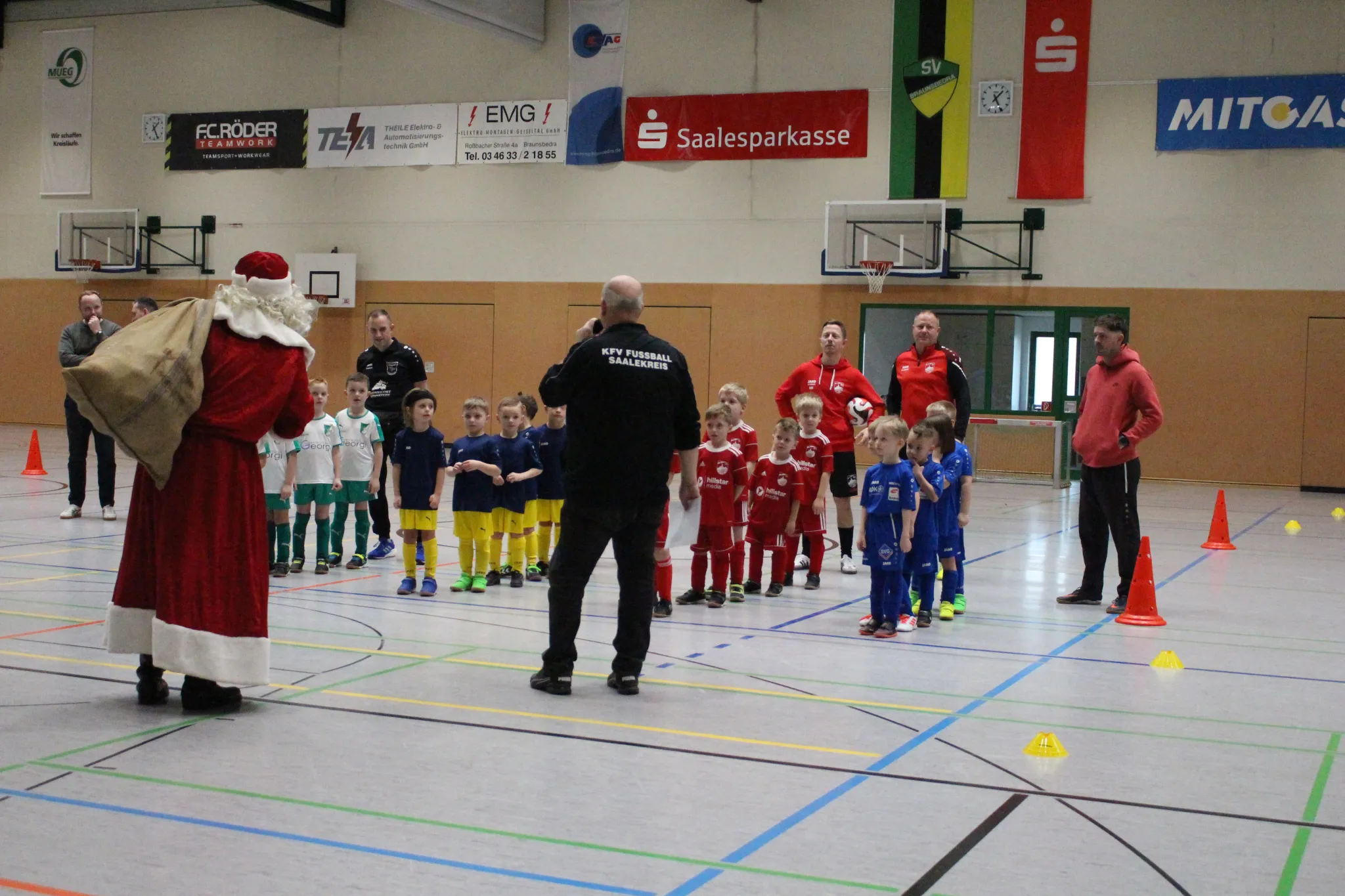 Das Bambini-Weihnachtsturnier des KFV Fußball Saalekreis wurde dieses Jahr in zwei 7er Gruppen in der St. Barbara Halle in Braunsbedra ausgetragen. Unsere Sportvereinigung nahm am Vormittag mit zwei Teams in Gruppe A und am Nachmittag mit einem Team in Gruppe B teil.