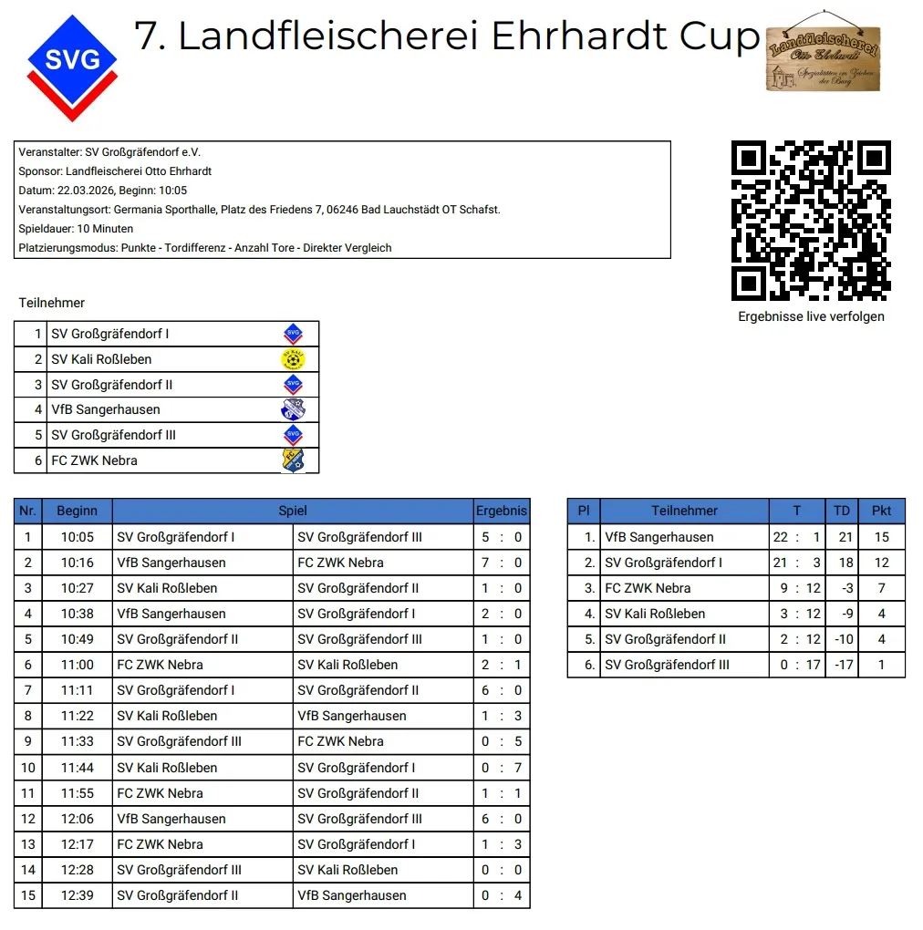Am 7. März 2020 veranstaltete die Sportvereinigung Großgräfendorf den sechsten und bis dato letzten Landfleischerei Ehrhardt Cup. Da die Corona-Pandemie eine Austragung im Folgejahr verhinderte, schlief die Tradition des beliebten Bambini-Turniers ein. Aber auch in den Folgejahren war und ist die Landfleischerei Otto Ehrhardt ein treuer Unterstützer unseres Vereins. Daher kam die Idee auf, das traditionelles Frühjahrhallenturnier für G-Junioren wieder aufleben zu lassen. Die Landfleischerei Otto Ehrhardt feiert übrigens in diesem Jahr ihr 25. Jubiläum. Geführt wird das Familienunternehmen mittlerweile von den Ehrhardt-Brüdern Kevin und Marcus. Neben der Gründungsfiliale in Weißenschirmbach, gibt es die beliebten Fleisch- und Wurstprodukte in den Filialen in Bad Lauchstädt, Merseburg und Querfurt.