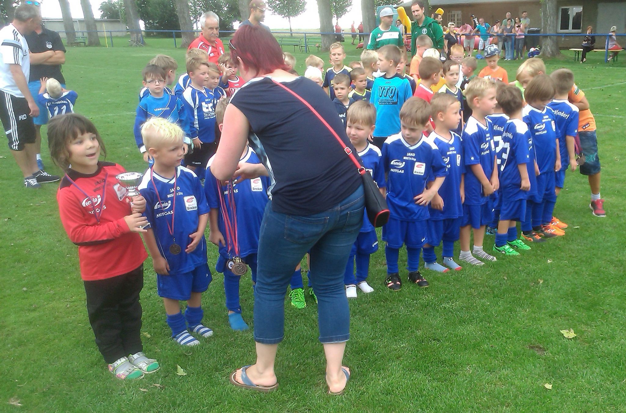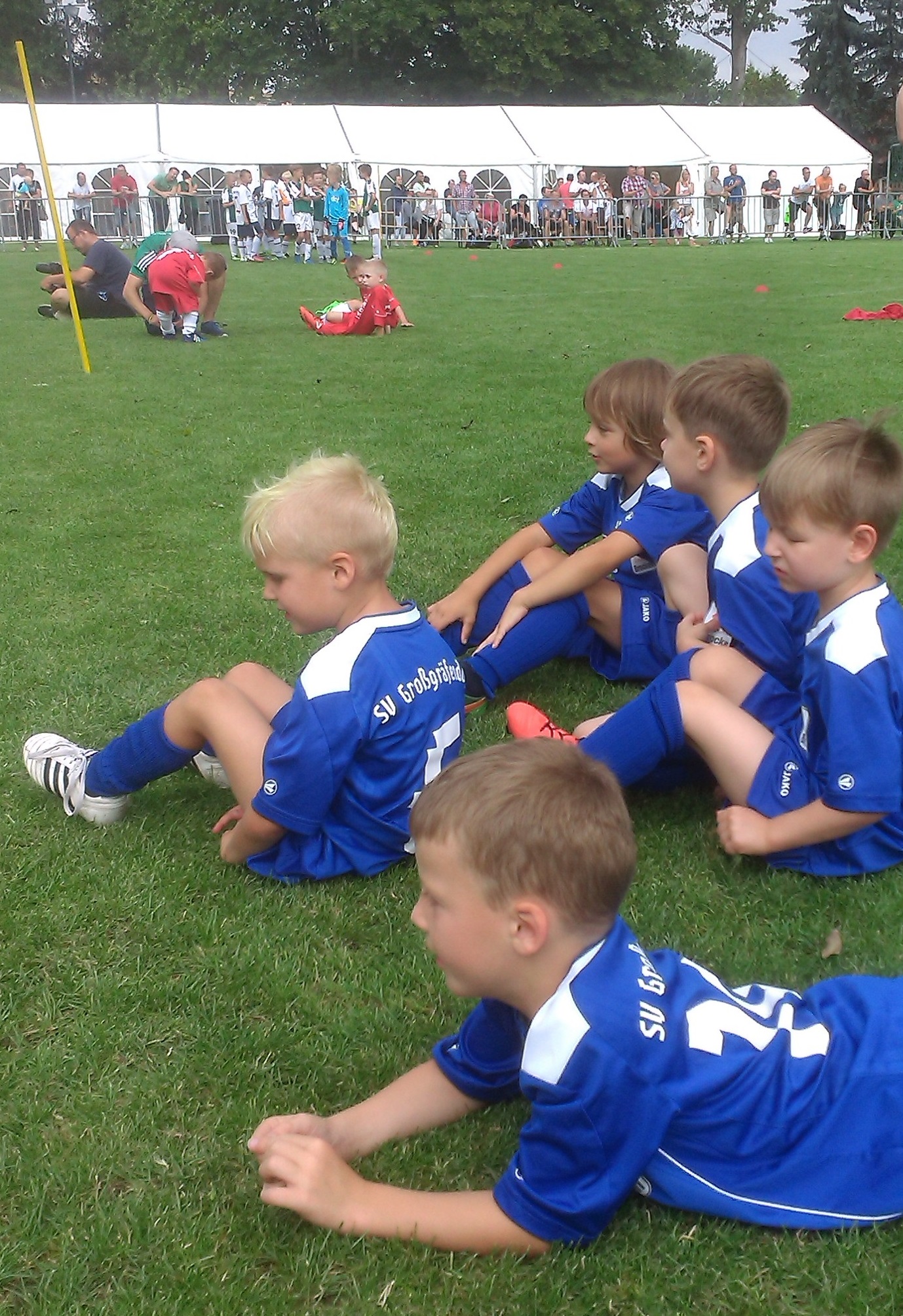 Das diesjährige Sportfestturnier unserer G-Junioren am 31. Juli konnte bei optimalen Rahmenbedingungen durchgeführt werden. Bester Rasen, Sonnenschein und viele Zuschauer boten eine hervorragende Kulisse für unsere sehr junge Mannschaft. Unserem einzigen richtigen G-Junior Max und seiner „Horde“ Mini-Bambini mit einem Altersschnitt von gerade einmal vier und dreiviertel Jahren flößten weder die zahleichen Besucher, noch die größeren Spieler der anderen Teams Angst ein. Vielmehr wollten sich heute alle euphorisch ins Getümmel stürzen.