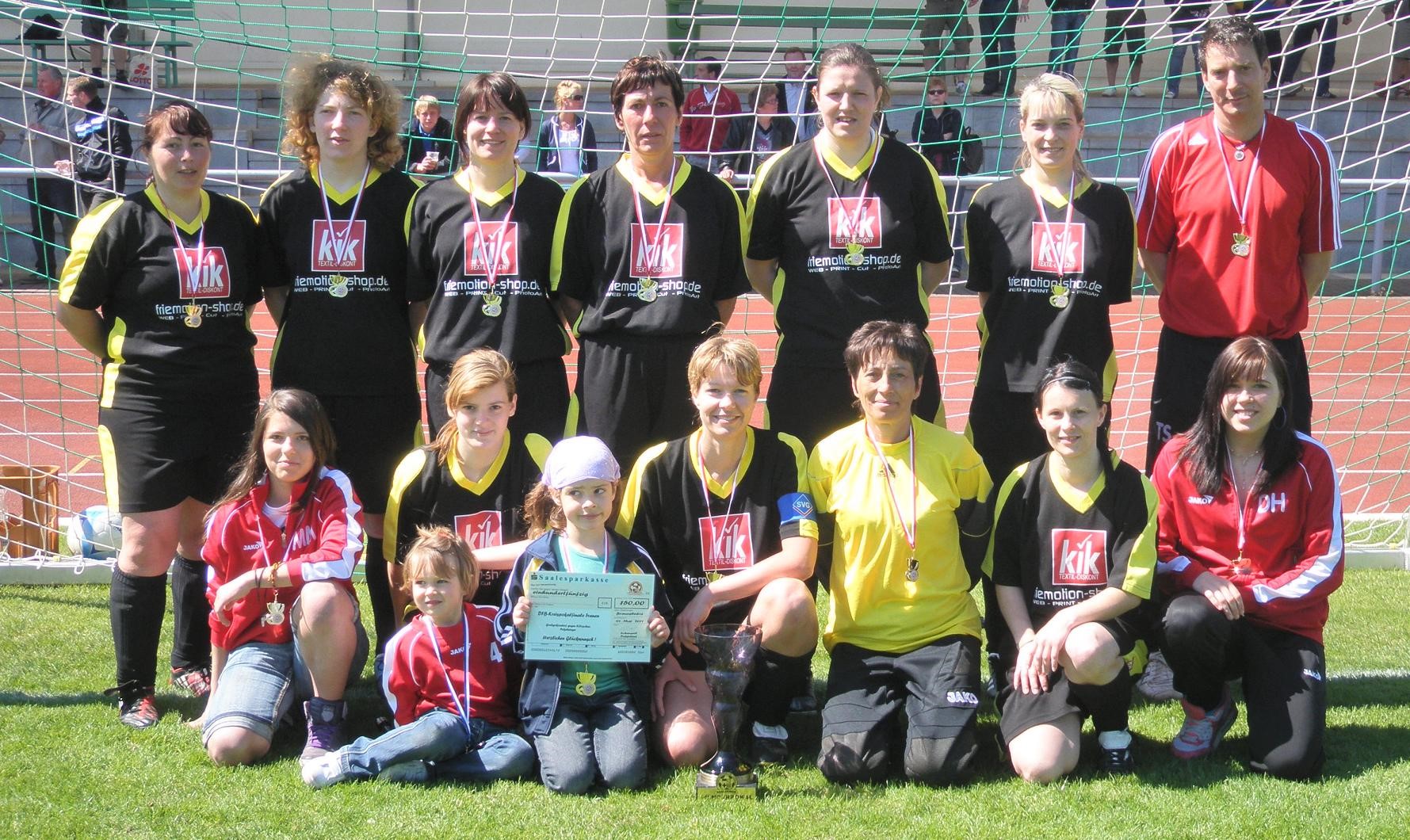 Bild unten: Die Großgräfendorfer Fußballerinnen errangen in der Saison 2010/11 in einem dramatischen Finale mit 3:1 nach Elfmeterschießen gegen den SV Germania Kötzschau erstmals den Kreispokal.
