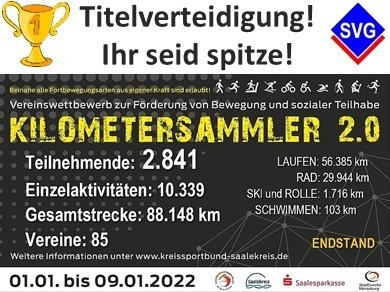 Daher kam die Neuauflage des KILOMETERSAMMLER-Wettbewerbs des KreisSportBundes Saalekreis gerade zur rechten Zeit, um unsere Mitglieder und Freunde des Vereins im neuen Jahr aus dem "Winterschlaf" zu wecken und zur Bewegung zu aktivieren.