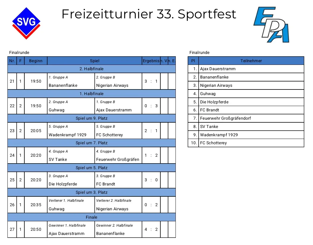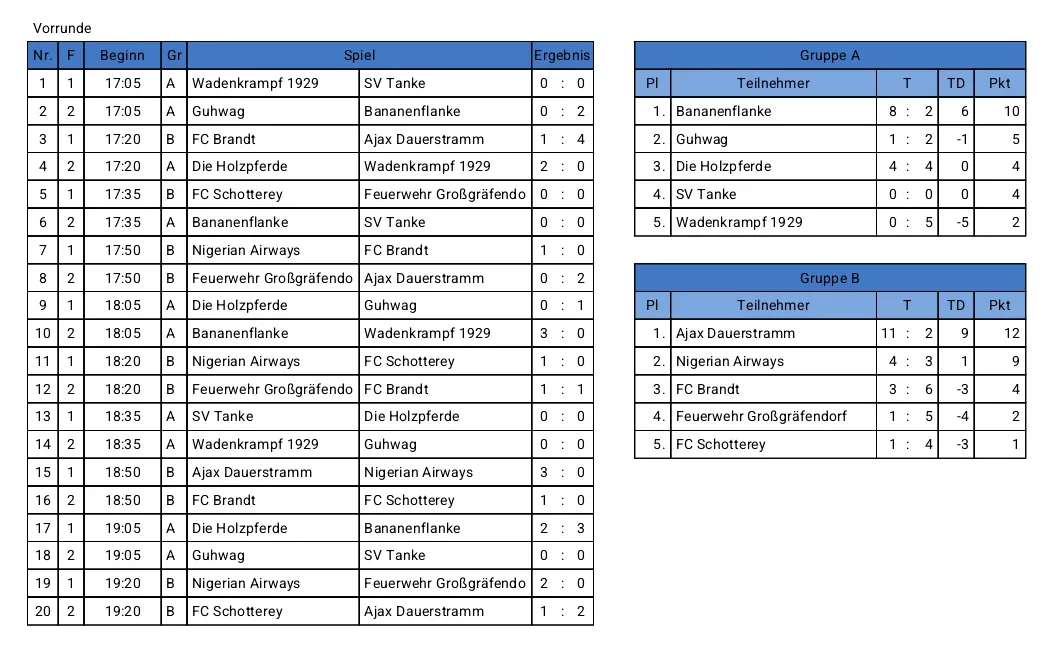 Die vielen Zuschauer sahen spannende Spiele mit der ein und anderen technischen Raffinesse. Den Siegerpokal erspielte sich erneut der zweifache Titelverteidiger, Ajax Dauerstramm, der damit den Titel-Hattrick perfekt machte. Im Finale setzte sich das Team um Spielführer Florian Just mit 4:2 gegen den Drittplatzierten des Vorjahres, Bananenflanke, durch. Das Podium komplettiert Nigerian Airways nach einem 2:0 gegen die Turnierüberraschung Guhwag ("Gegen uns hätten wir auch gewonnen.").