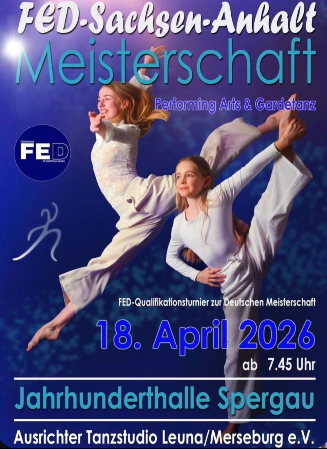 Am 18. April richtete das Tanzstudio Leuna/Merseburg in der Jahrhunderthalle Spergau die FED-Sachsen-Anhalt Meisterschaft Performing Arts & Gardetanz aus. FED steht für Federation of European Dance.