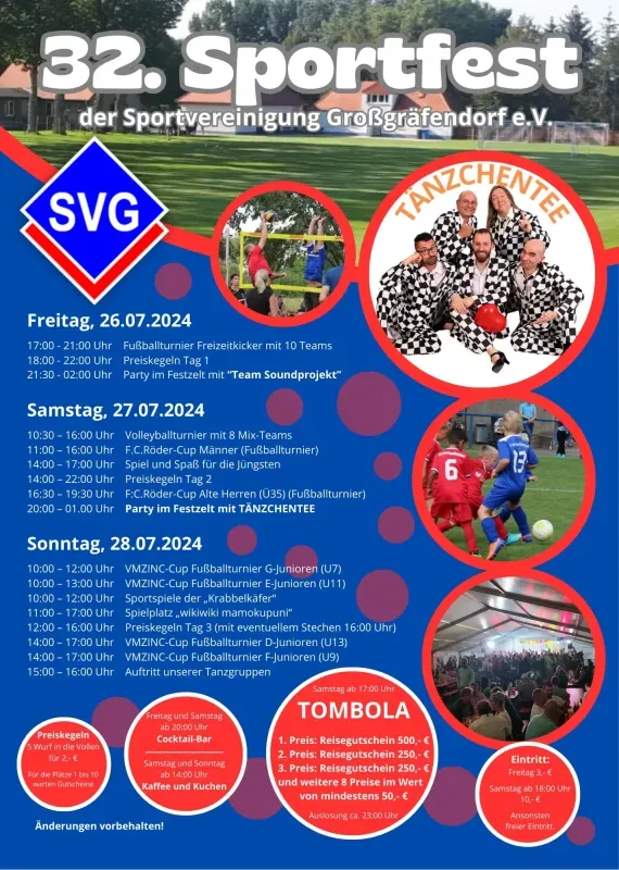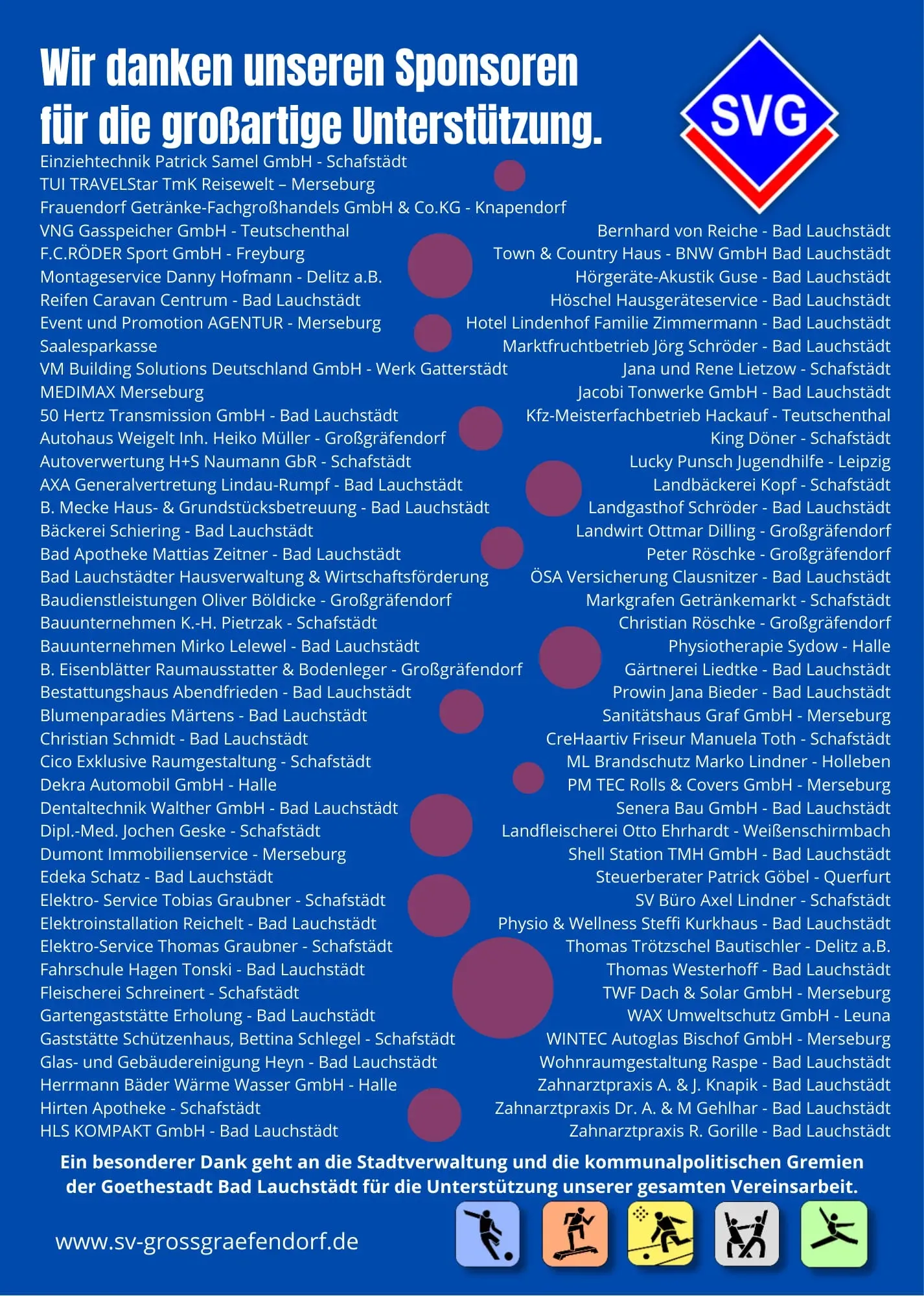 Am letztem Juliwochenende stand im Bad Lauchstädter Ortsteil Großgräfendorf traditionell der Sport im Mittelpunkt des Dorflebens. Von Freitag, den 26. Juli bis Sonntag, den 28. Juli veranstaltete die Sportvereinigung Großgräfendorf ihr 32. Sportfest. Den sportlichen Auftakt bildete das 22. Fußballfreizeitturnier, an dem zehn Freizeitmannschaften teilnahmen. Den Siegerpokal erspielte sich der Titelverteidiger, das Team Ajax Dauerstramm, welches sich im Finale mit 2:0 gegen den FC Brand durchsetzte. Vorjahresfinalist Bananenflanke komplettierte das Podium. Auf den weiteren Plätzen folgten: 4. FC Tanke, 5. Hangover, 6. SVG B-Jugend, 7. Guhwag, 8. Fire Fighter Großgräfendorf, 9. SVG Freizeitkicker, 10. Lokführer. Am Freitagabend feierten die knapp 500 Gäste zu den Discohits des „Team Soundprojekt“.