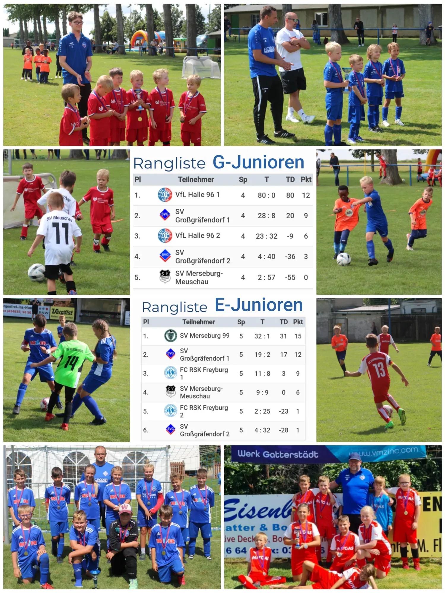 Am Sonntag standen wie gewohnt die Kinder und Jugendlichen im Mittelpunkt, zunächst die knapp 200 anwesenden Nachwuchsfußballer. Angefeuert von einer tollen Zuschauerkulisse zeigten die Jungs und Mädchen bei den Turnieren des VMZINC-Cups ihr Können und wetteiferten fair um die Pokale und Medaillen, bereitgestellt von der Event und Promotion Agentur Merseburg. Im Folgenden die Platzierungen der einzelnen Turniere: D-Junioren: 1. SV Großgräfendorf I, 2. SV Blau-Weiß Farnstädt, 3. SV Großgräfendorf II, 4. TSV Leuna, 5. FSV Bennstedt. E-Junioren: 1. SV Merseburg 99, 2. SV Großgräfendorf I, 3. FC RSK Freyburg I, 4. SV Merseburg-Meuschau, 5. RSK Freyburg II, 6. SV Großgräfendorf II. F-Junioren: 1. SV Merseburg 99, 2. FSV Raßnitz, 3. VfL Halle 96, 4. SV Großgräfendorf II, 5. SV Großgräfendorf I, 6. SV Großgräfendorf III. G-Junioren: 1. VfL Halle 96 I, 2. SV Großgräfendorf I, 3. VfL Halle 96 II, 4.SV Großgräfendorf II, 5. SV Merseburg-Meuschau.